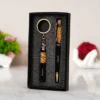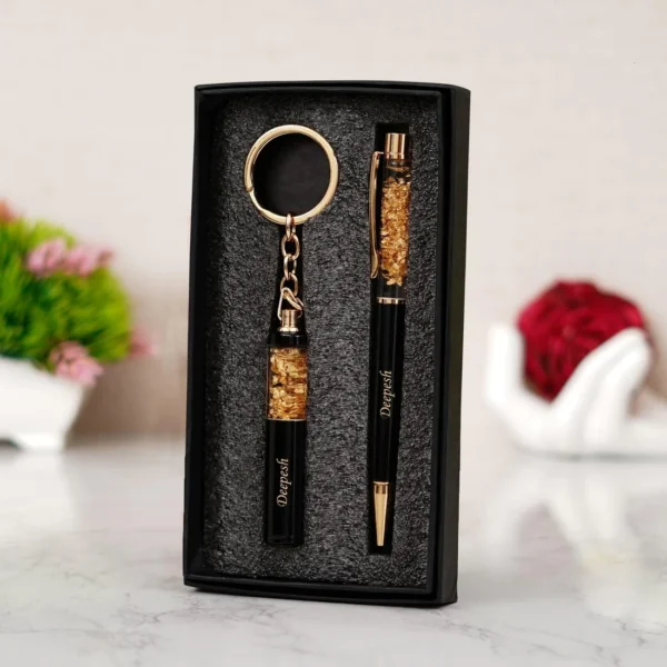 High quality finish in Black and Gold with a rich, polished tone, become the bearer of this magnificent combo of a Premium Pen and a Keychain. Personalized with names on both, this combo exudes chicness and class. Comes in a gift box for easier gifting.